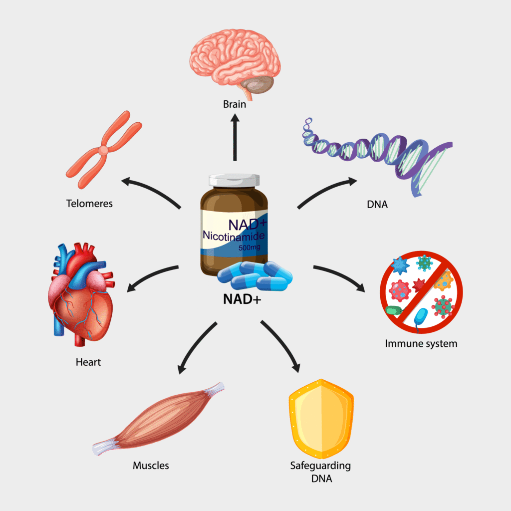 - DNA onarımını destekler. (NAD, hücre hasarını ve DNA bozulmalarını onararak hücrelerin sağlıklı kalmasına yardımcı olur. Bu da uzun vadede hücre fonksiyonlarının korunmasını sağlar.)